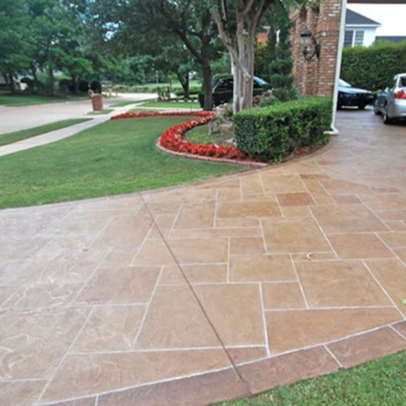 A driveway doesn’t have to be boring gray concrete. With our quartz- and stone-based overlays, we hand-carve patterns and add custom colors that mimic the look of flagstone, slate, or even high-end pavers. The result is a driveway that actually adds value to your property and sets your home apart. From rich browns to subtle grays to golden highlights, you choose the look, and we make it